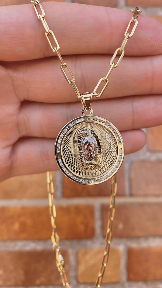 Virgencita de Guadalupe Necklace Paper Clip Chain 14K Gold Filled Toddler Youth Womens and Mens