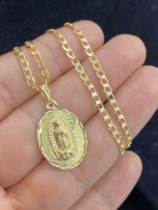 24" Yellow Virgen De Guadalupe Necklace Diamond Cut Womens Curb Chain 14K Gold Filled