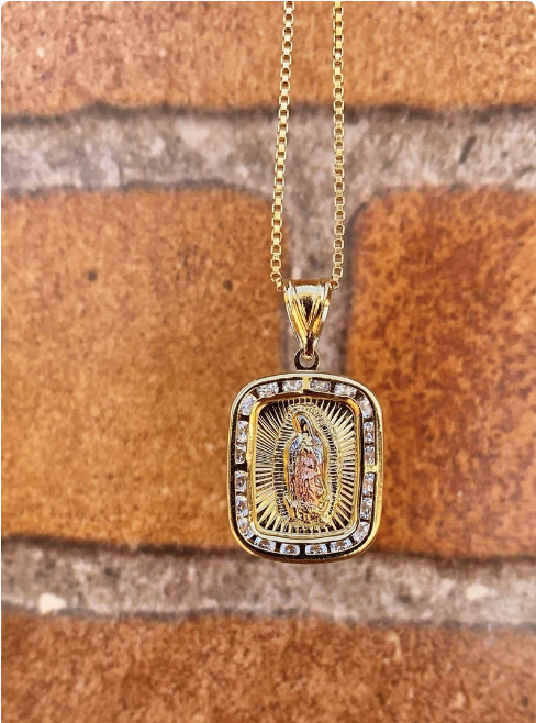 Virgen de Guadalupe Necklace 18" CZ Box Chain 14K Gold Filled Womens Mens Unisex