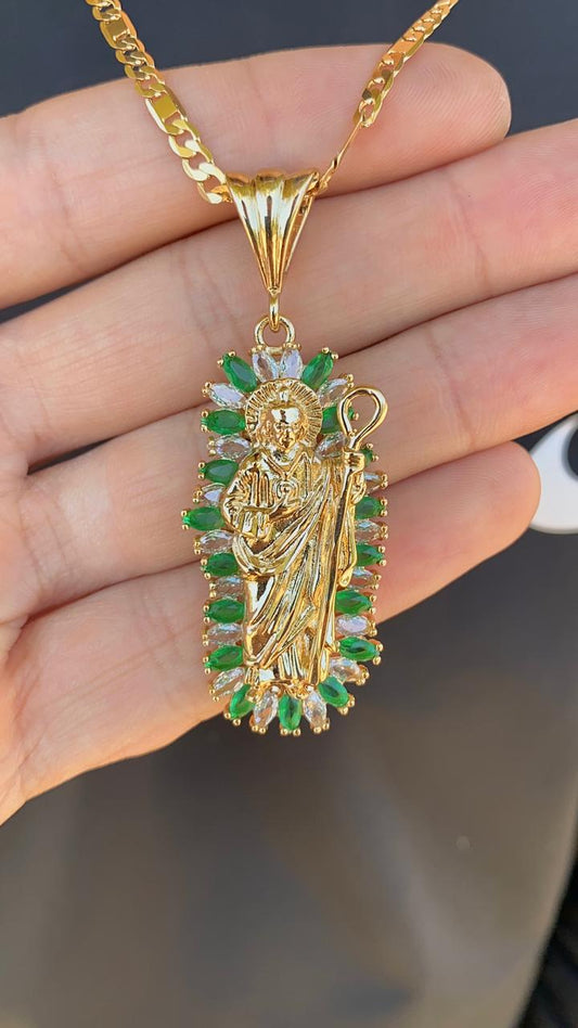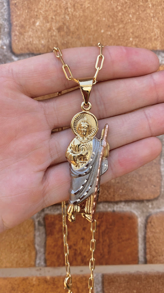 Tri Color San Judas Necklace 14K Gold Filled Paper Clip Chain St Jude Pendant 20"