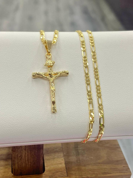 Rustic Cross 14K Figaro Chain GF Necklace Pendant 24" Gifts Catholics