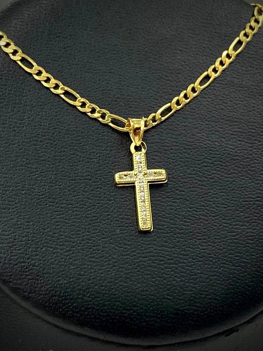 Small Cross Necklace Pendant CZ 14K Gold Filled Womens Kids Crucifix Figaro Chain 17x10