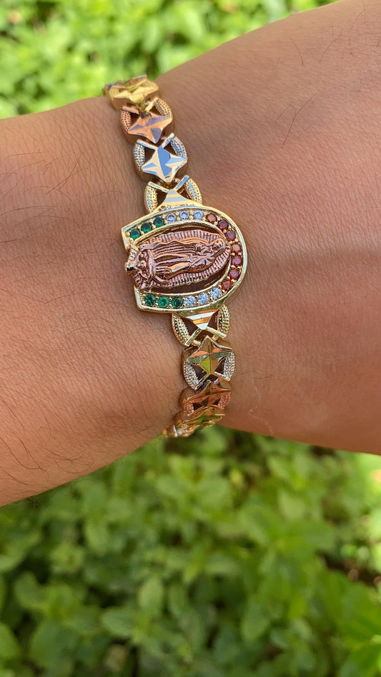 Virgen de Guadalupe Bracelet Green Red Clear CZ Stones Tri Color Gold Filled 7.5" for Womens